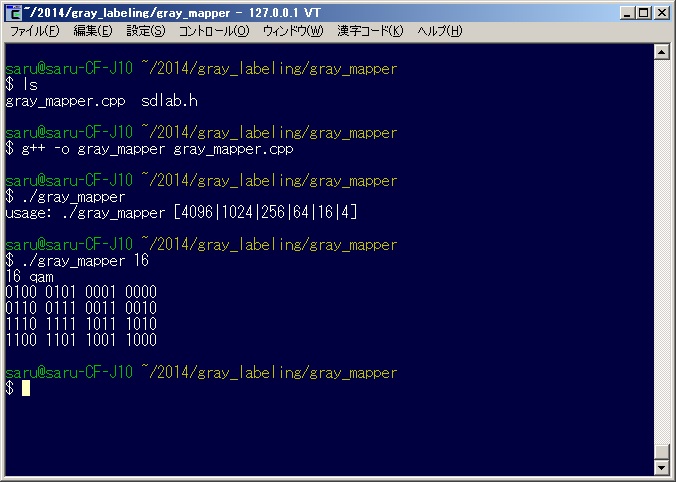 主要な関数: make_gray_label †グレイラベルを作成する関数。引数のsizeには信号点の数を入れます。uimatはuint16_t(16bitのunsigned int)の行列用の自作関数です。2次元配列を**qamとかで渡してqam[1][1]とかでアクセスしたかったので作りました。2次元配列は少しポインタが面倒くさい... void make_gray_label(int size, uint16_t **qam)
