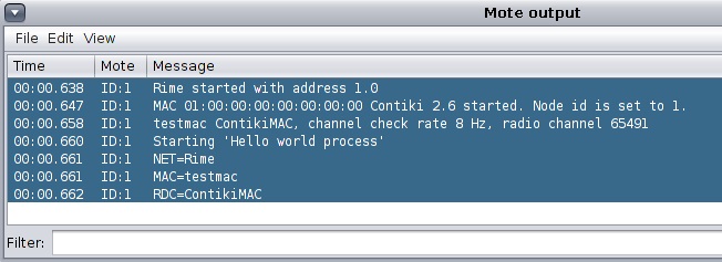 コンパイル †$ sudo make test10.upload TARGET=sky MOTES=/dev/ttyUSB0 実行結果 †coojaでの実行結果です。 testmacがロードされているのが分かります。 |