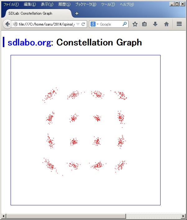 constellation.htmlを開くと↓な感じです。 16QAMの光通信の処理をこのツールでプロットしてあげると↓な感じになります。量子雑音で信号点の位相が回転しているのが見えます。 HTMLのソースコードの一部を見せると↓な感じ。そんなに複雑なことはしていないです。 <script type="text/javascript">