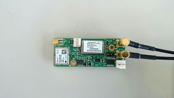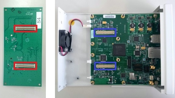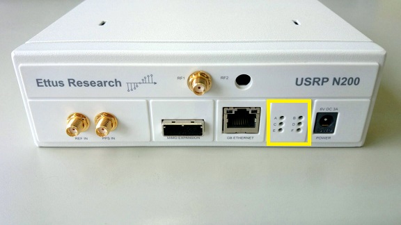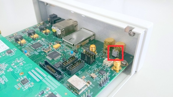 USRP-N200へのドーターボードの取り付け †USRPは、ドーターボードを交換することで、様々な 周波数の電波を出力することが出来ます。 この例では、ドーターボードとして2.4GHz帯と5GHz帯に対応した XCVR2450を用いています。 以下からUSRP-N200へのドーターボードの取り付けについて説明していきます。 まず、USRP背面のねじを外してケースを開きます。 次に、ドーターボードを用意します。 この例では、ドーターボードとしてXCVR2450を用いています。 このドーターボード背面の赤色の四角部分(左図)と、 USRPの青色の四角部分(右図)を接続します。 この時、ドーターボードの向きに注意してください。 ドーターボードを取り付けると以下のようになります。 最後に、ドーターボードの出力とUSRP表面の穴を 付属のSMA(オス)-SMA(メス)ケーブルで接続します。 出力はJ1とJ2の2つがありますが、どちらでも構いません。 アンテナを取り付け、電源ケーブルを接続して、 ギガビットイーサネットケーブルでPCと接続すれば完成です。 USRP-N200へのGPSDO Kitの取り付け †USRPは個体によって周波数偏差があるため、Ettus社では それぞれの個体の周波数偏差を無くすためのGPSDO Kit を提供しています。 以下からGPSDO Kitの取り付けについて説明していきます。 GPSDO Kitの概観は以下の図のようになっております。 (取り外しが出来なかったため、以下の図はSMB-SMAケーブルが接続後の図になっております...) GPSDO Kitを接続する前に、USRP-N200がGPSDO Kitから信号を受け取るために USRP-N200内のジャンパピンの付け替えをします。 通常は外部からの信号を受け取るためにジャンパピンは 以下の図中、赤線四角内のようになっています。 USRP-N200がGPSDO Kitから信号を受け取るためにジャンパピンを 以下の図中、赤線四角内のように変更します。 その後、GPSDO Kitを以下の図のようにUSRP-N200内に取り付けます。 USRP-N200はUSRP-N200内に付属のネジ2つで止め、 SMB-SMAケーブル、パワーコネクタ、シリアルケーブル、MMCX-SMAケーブルを 以下の図のように接続します。 以下の図は別角度からの写真になります。 最後に、ドーターボードとアンテナを取り付けます。 USRP-N200表面のLEDについて †USRP-N200表面にはUSRP-N200の状態を示すLED(下図、黄線四角内)があります。 これらのLEDは以下の動作に対応しています。