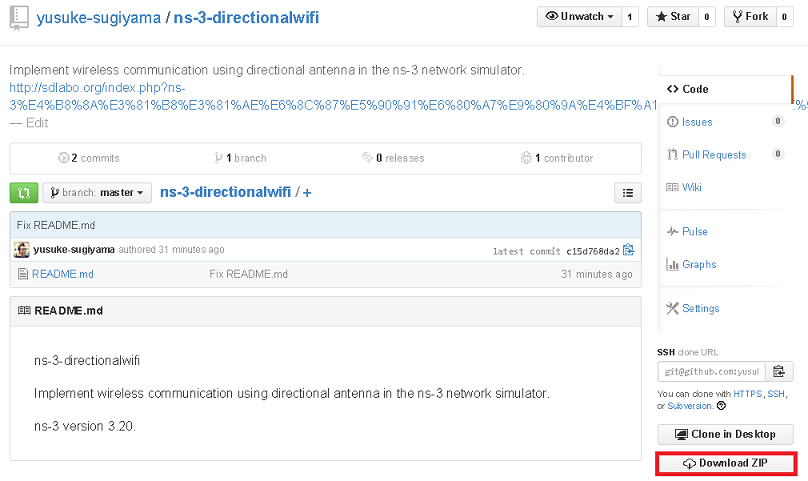 まず、git(ns3-directionalwifi)からソースコードをダウンロードします。https://github.com/yusuke-sugiyama/ns-3-directionalwifiを開くと↓のページが表示されます。